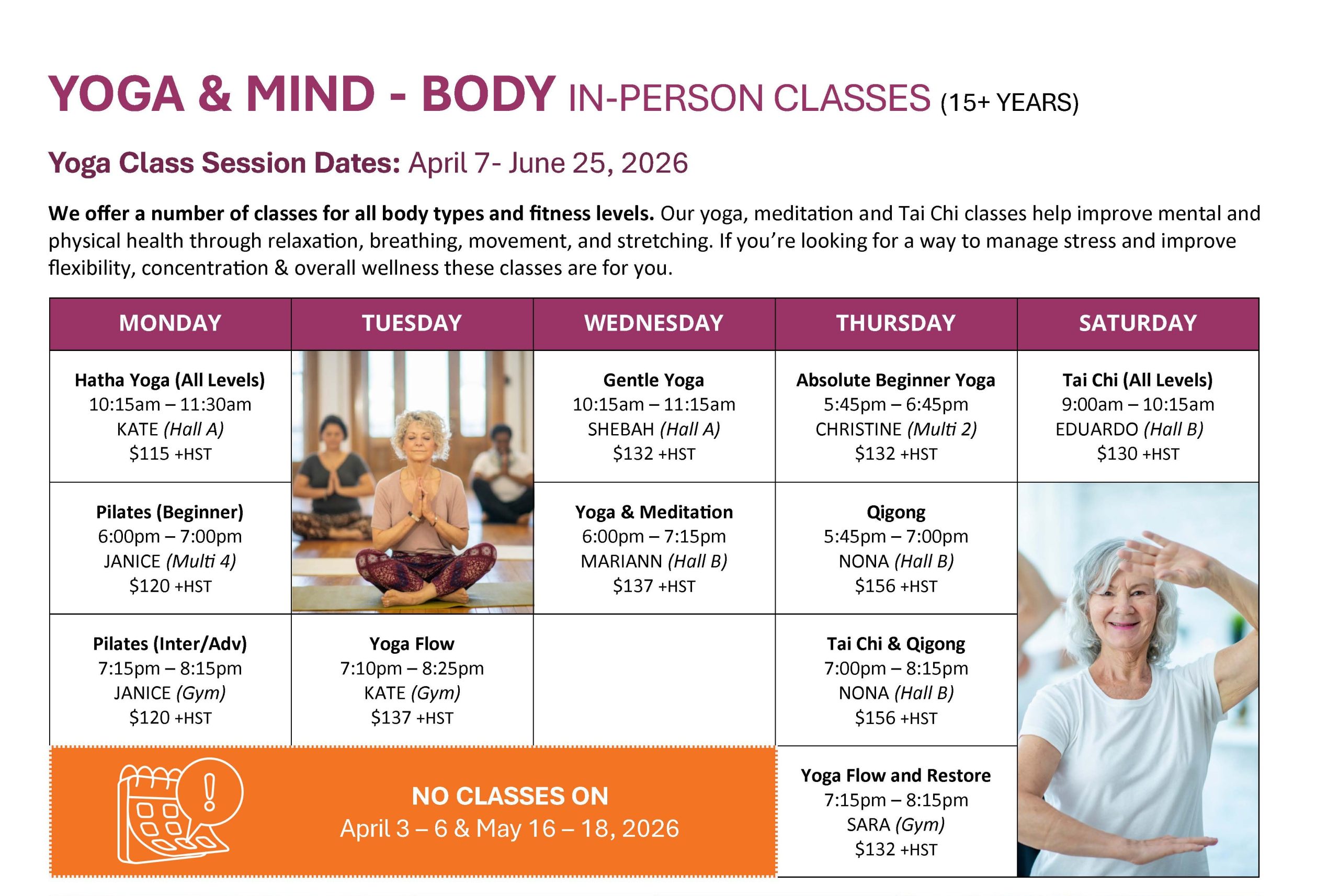 Group Fitness, 50+ GOLD Fitness, Sit Fitness, Zumba, Art, Yoga, Meditation, Tai Chi, Qigong, Karate, Ballroom, Tango, Kids programs, Children’s Dance and more.
